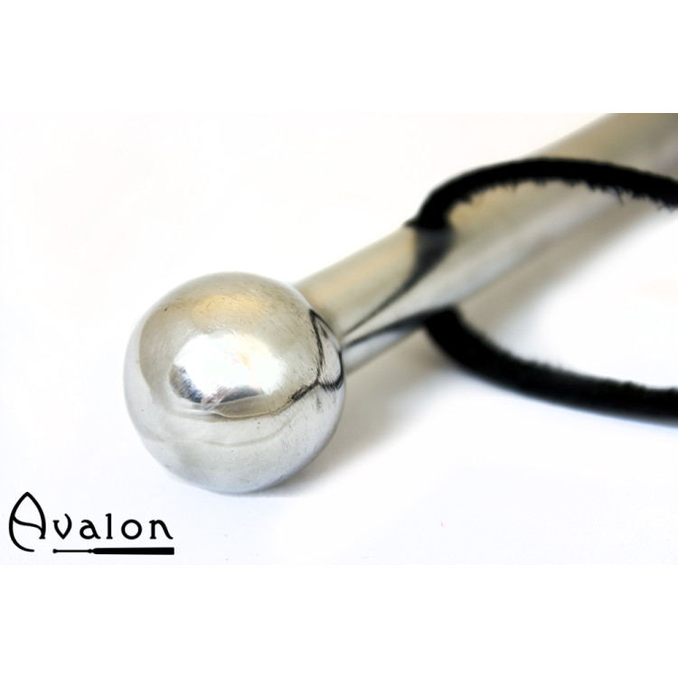 Paddelen har et langt metallhåndtak, den er smal og har hjerte avtrykk på enden.