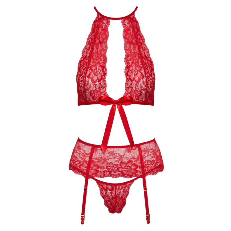Inkluderer en overdel, hofteholder og matchende string i nydelige, røde blonder.
