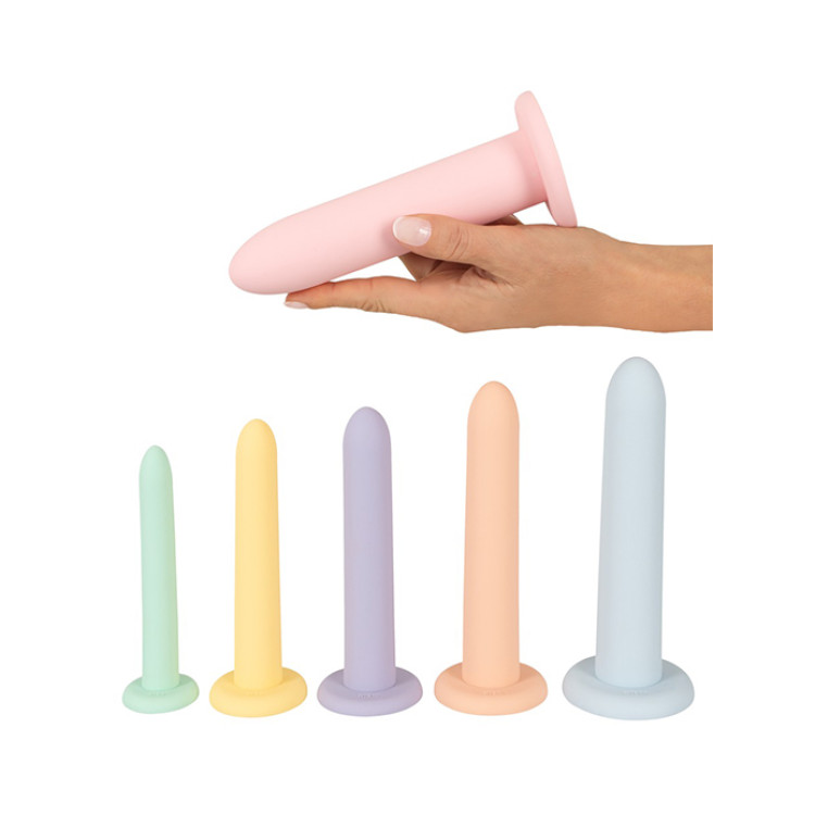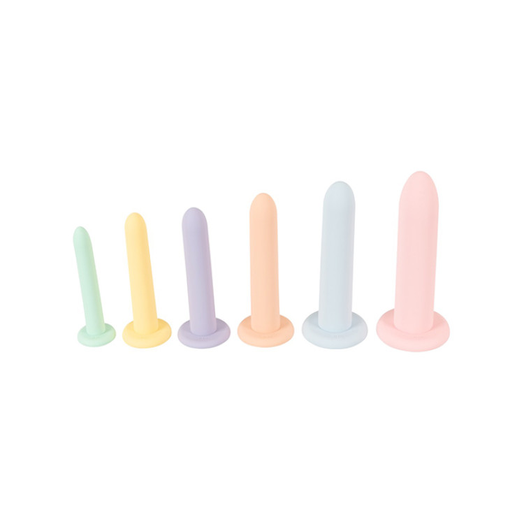 Settet kommer med seks dildoer i forskjellige, delikate pastellfarger. De varierte størrelsene gjør det enkelt å gradvis øke intensiteten og tøyningsgraden, som er ideelt for person som gjennomgår behanling for vaginisme eller kjønnskorrigerende kirurgi.