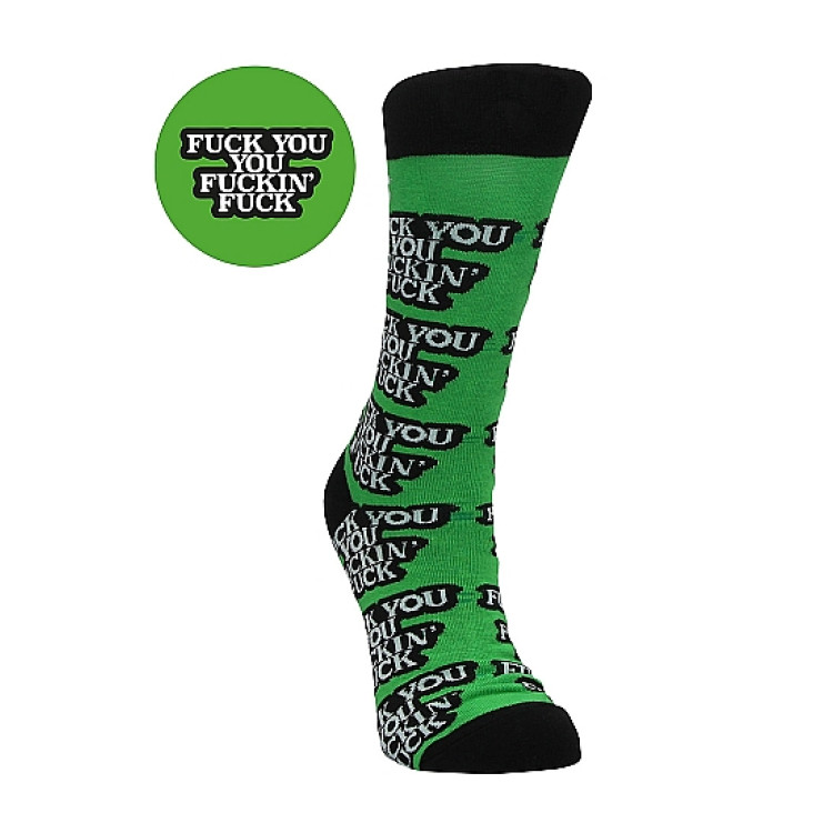 Disse "Fuck you" sokkene fra Sexy Socks gir et tydelig budskap! "Fuck you" budskapet danderer den ellers grønne og sorte sokken.